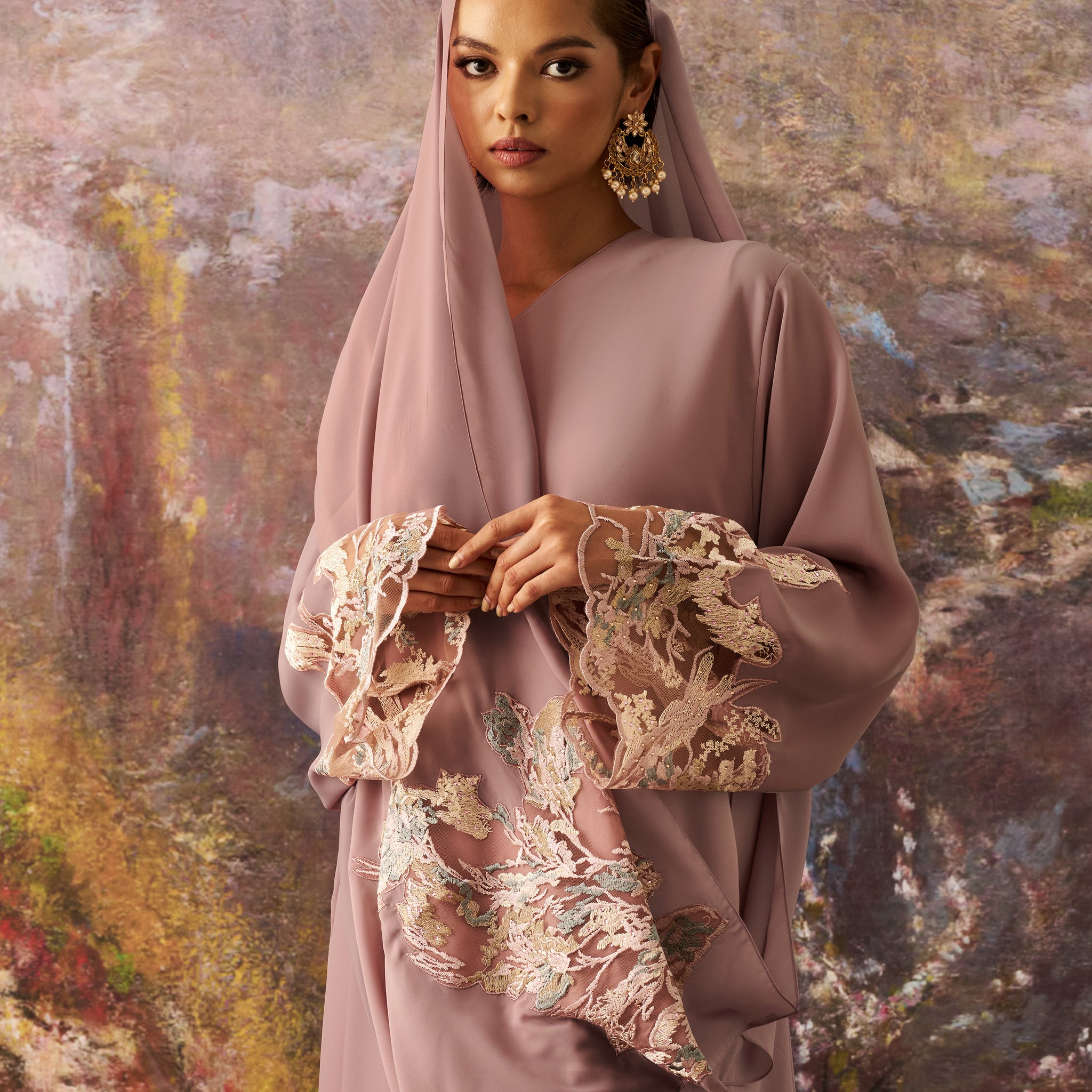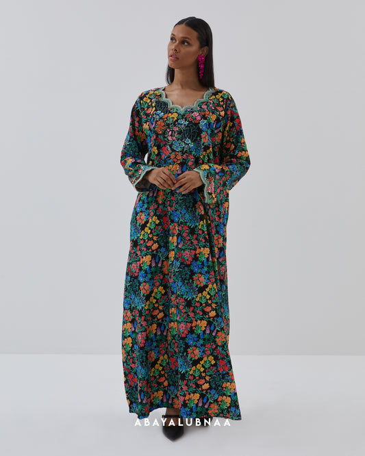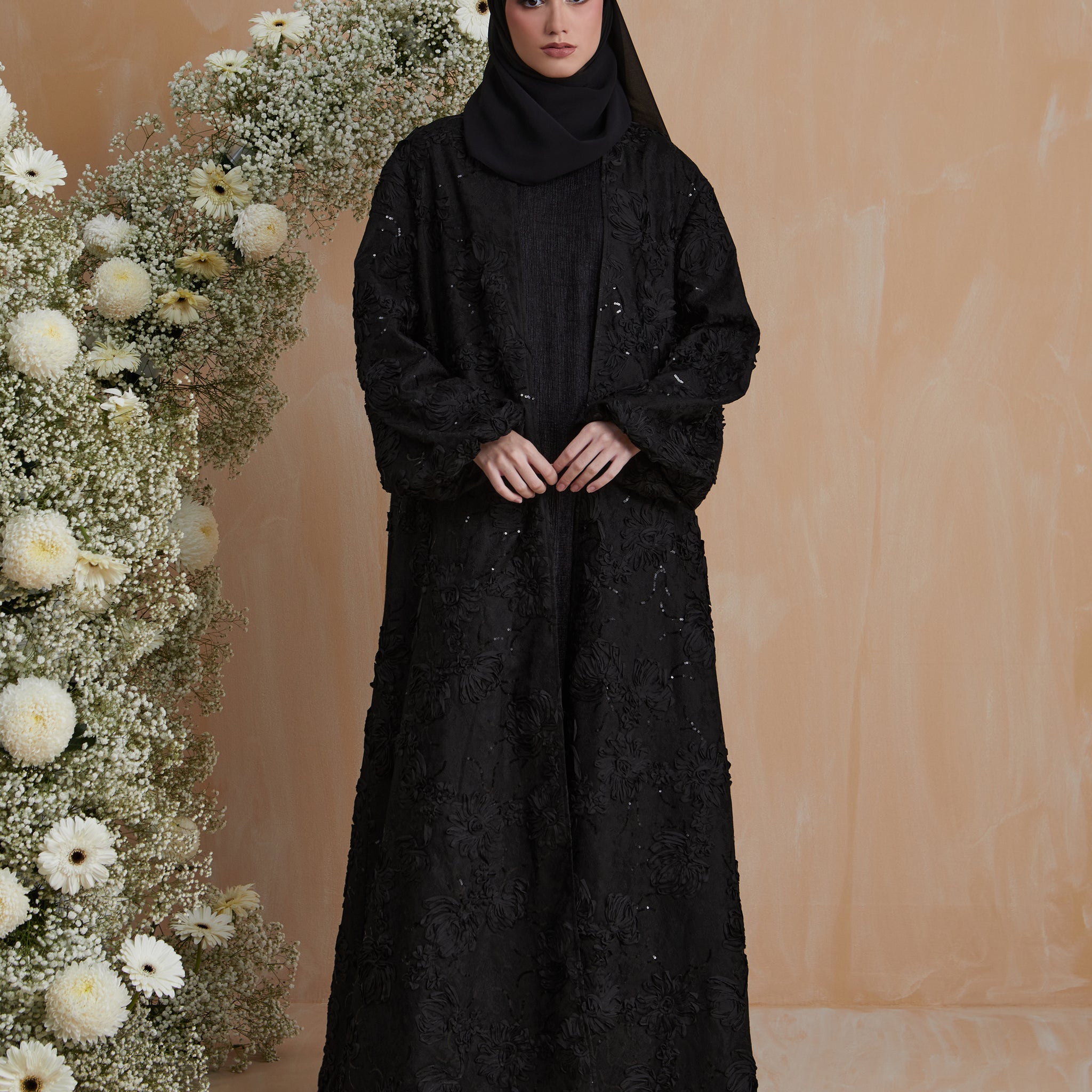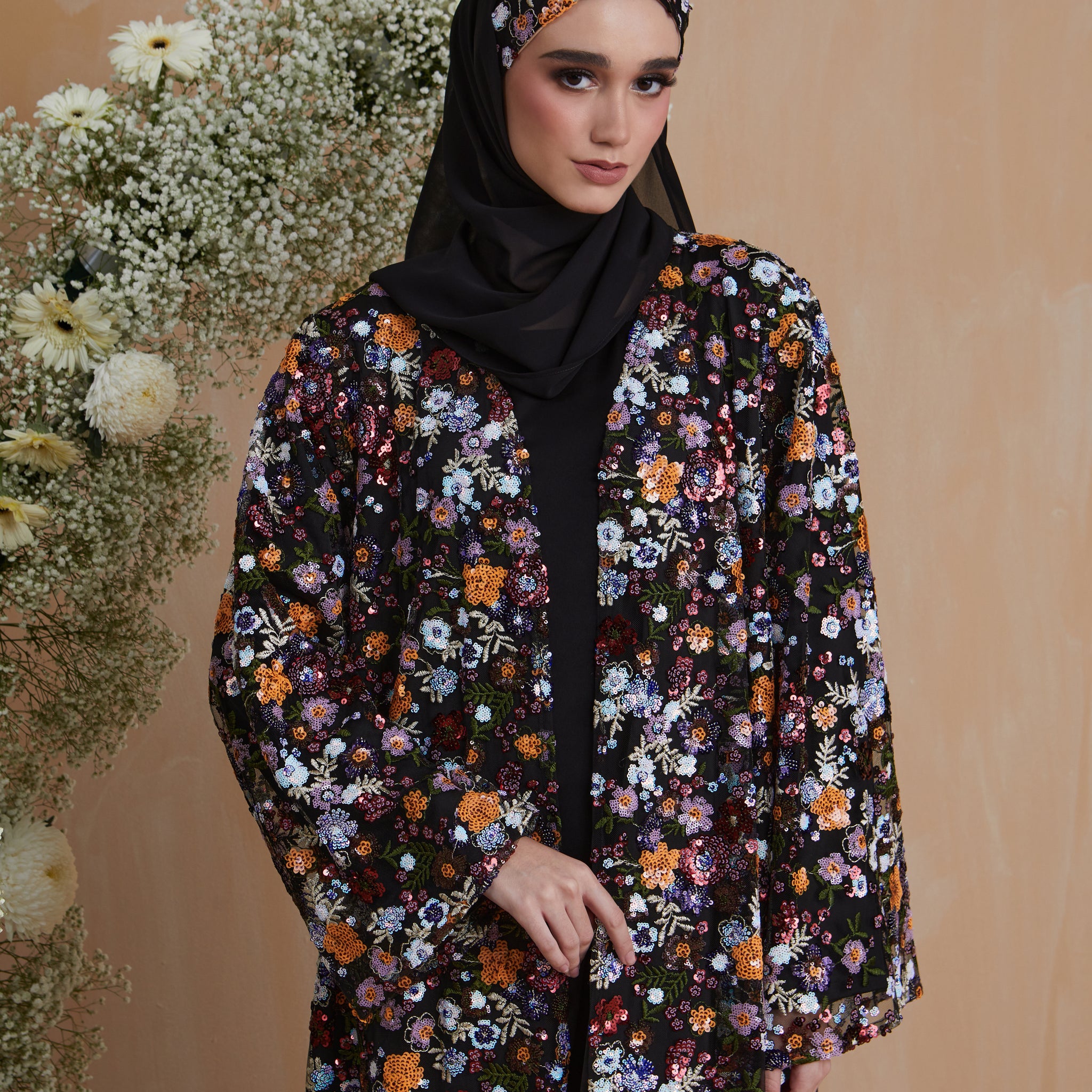 Intricate embellishments and fun florals make Amara an abaya that is contemporary yet timeless. Cut in a relaxed straight cut silhouette, Amara is crafted in soft Nidha fabric, weighted on the bottom by the sparkly stones to enhance its flowing shape.