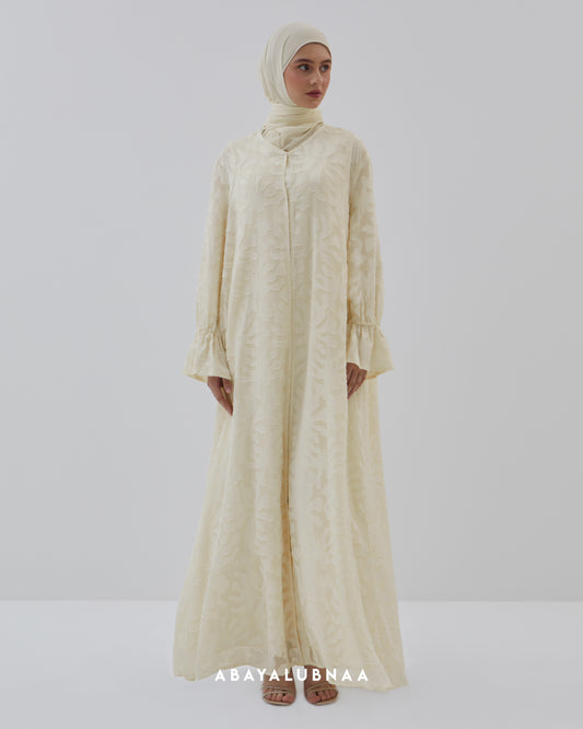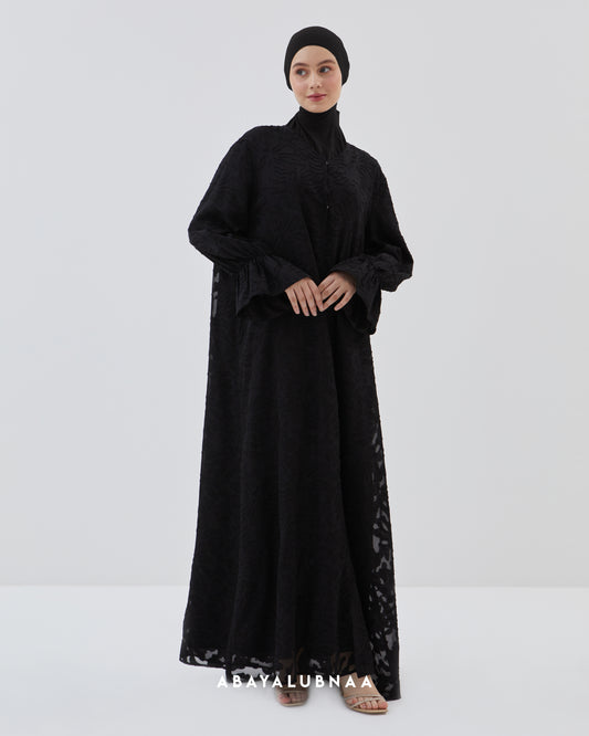 Peekaboo lace form a border along the cuffs, then the embellishments are repeated on the bottom of the abaya to create a cohesive style, drawing your eyes to the full length of the garment so you can appreciate the design in its entirety.