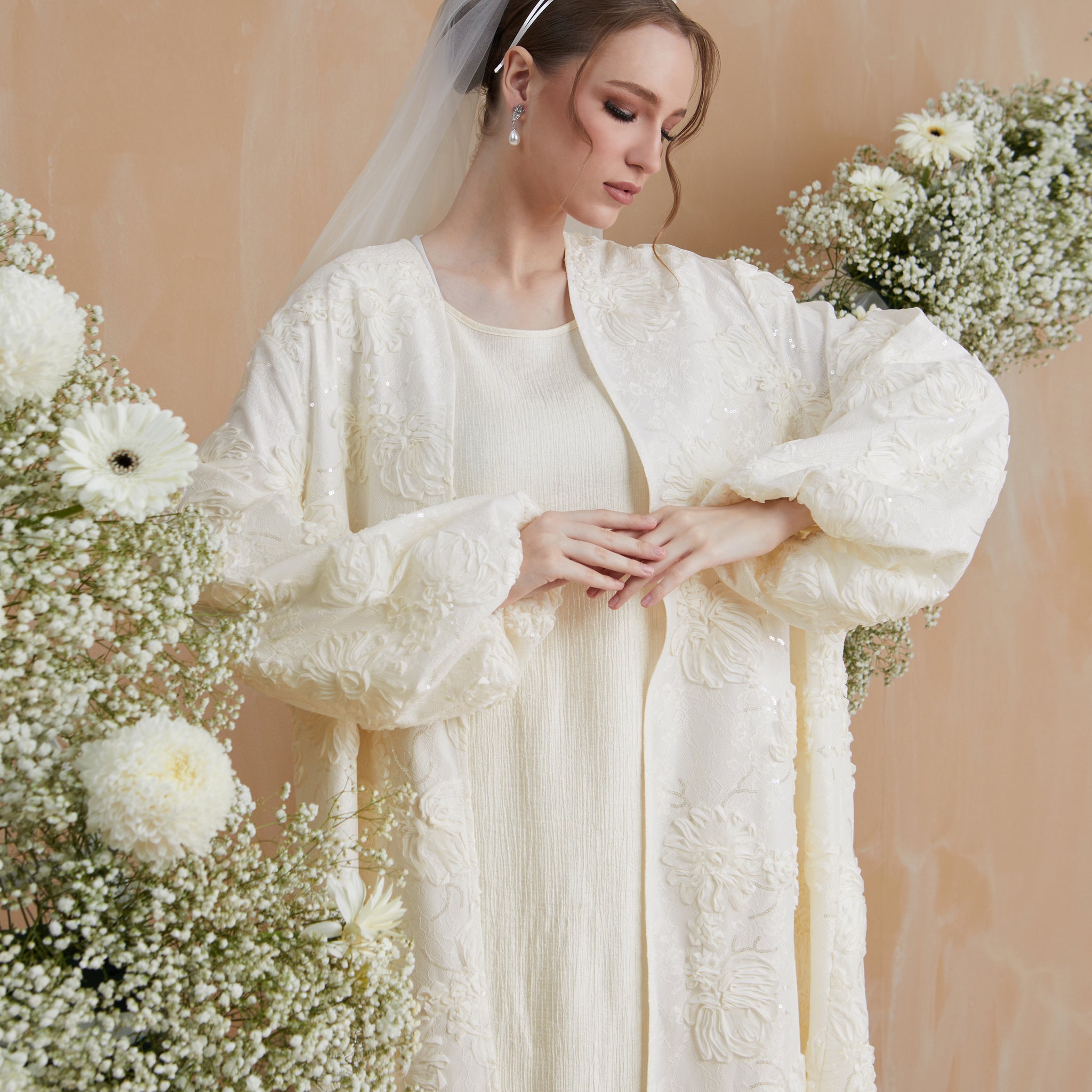 Daphne, strong and daring, is not for timid wallflowers. Statement sleeves are fully covered by 3D blossoms embellished with sparkly crystal centres, bold and head-turning elements that commands attention wherever you go.