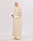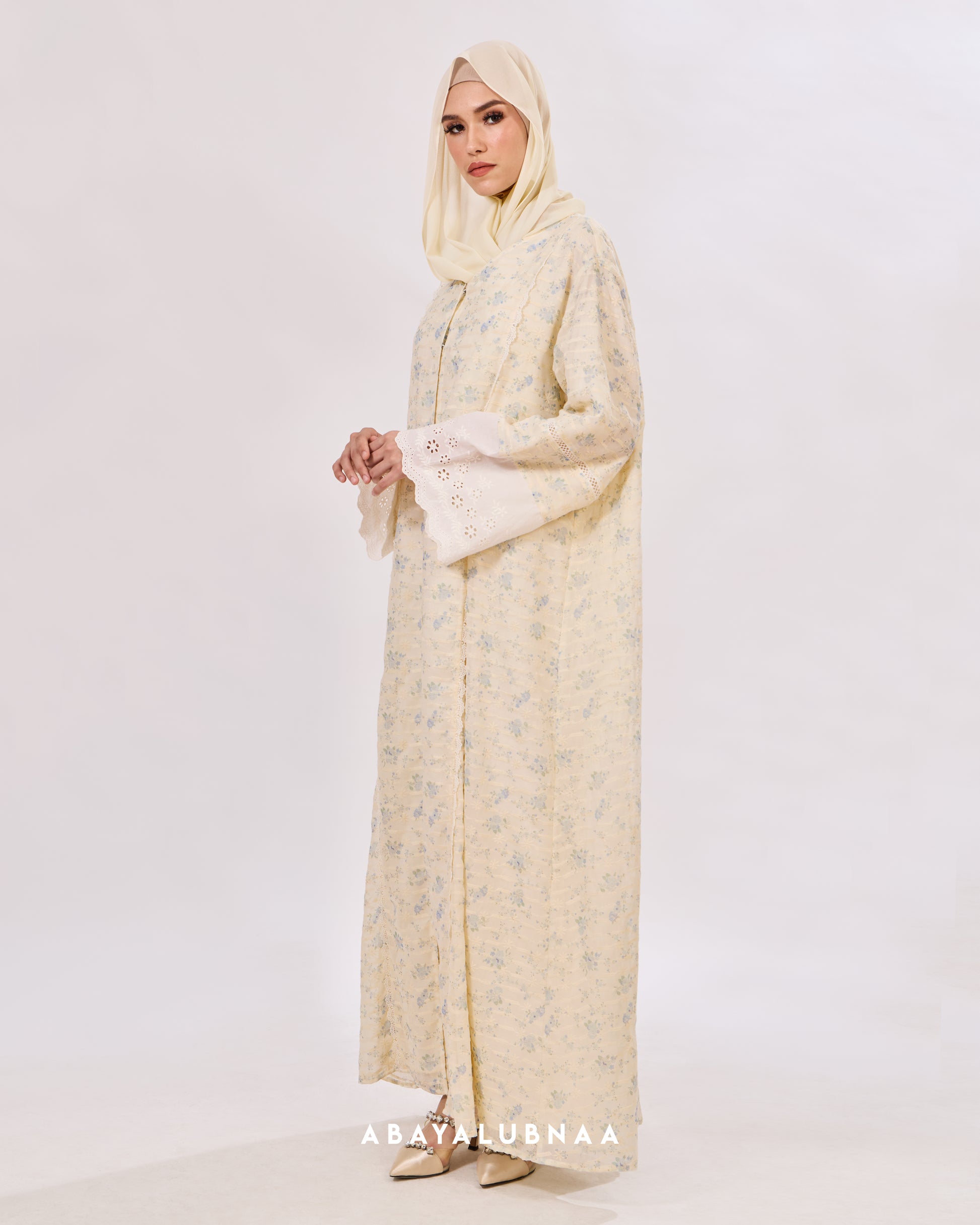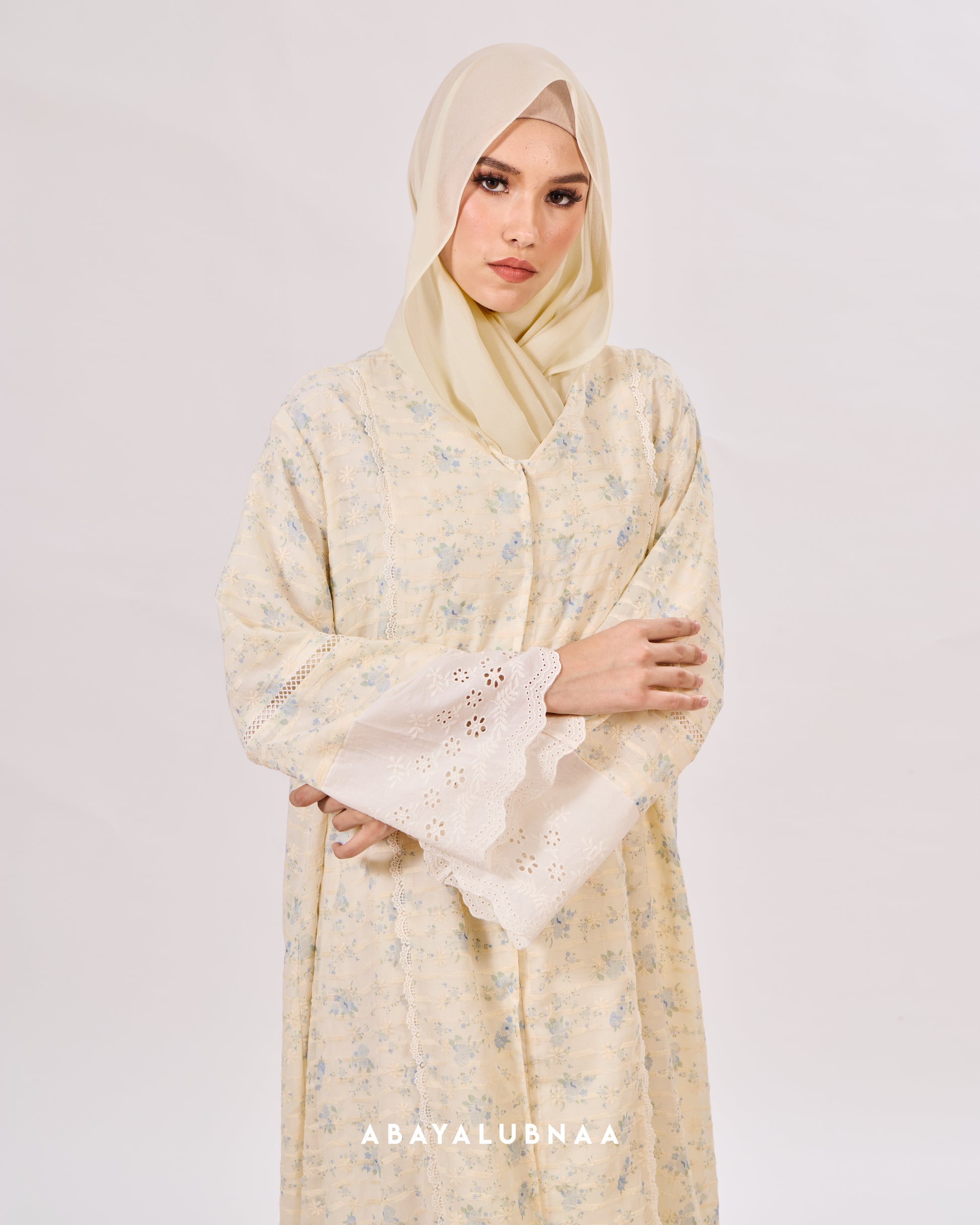Highlights of Isma include a pastel flower print and contrasting panels that frame the cuffs. Thick lace borders and eyelets anchor the abaya, adding different textures for more depth and dimension.