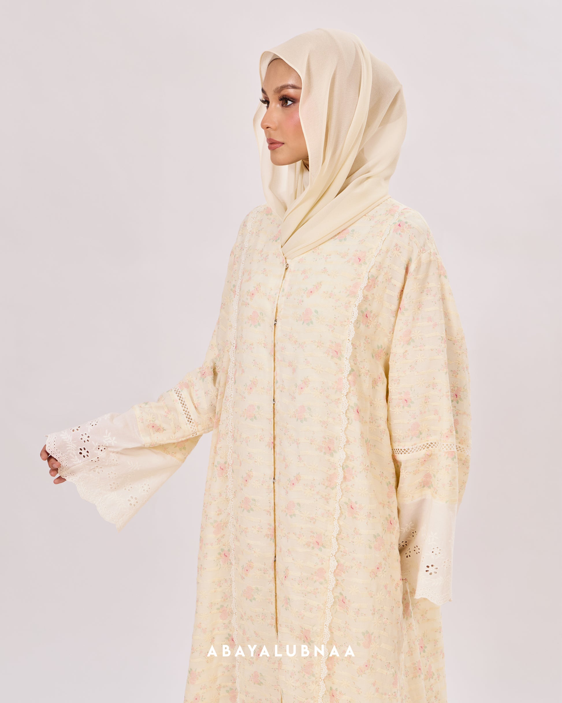 Highlights of Isma include a pastel flower print and contrasting panels that frame the cuffs. Thick lace borders and eyelets anchor the abaya, adding different textures for more depth and dimension.
