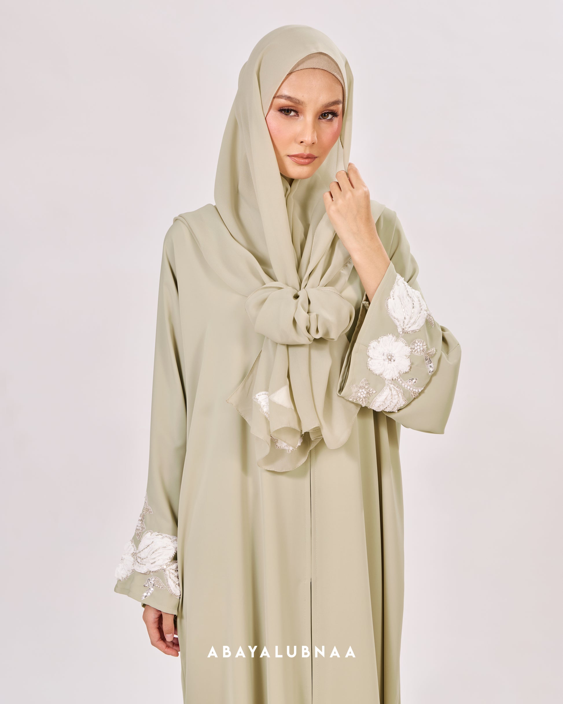 Channeling romance with a nod to vintage aesthetics, Maleeha is an elaborate abaya traced with floral lace on the cuffs and appliqued with bountiful blossoms on the sides and back.