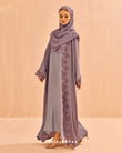 Maysaa embraces florals with gorgeous lilies appliqued over the front and cuffs to create a lovely 3-D effect. Borrowing elements from bold embellishments in Moroccan garments, hand-placed rhinestones saturate the lace to resemble dew drops for a whimsical and glitzy charm to the design.