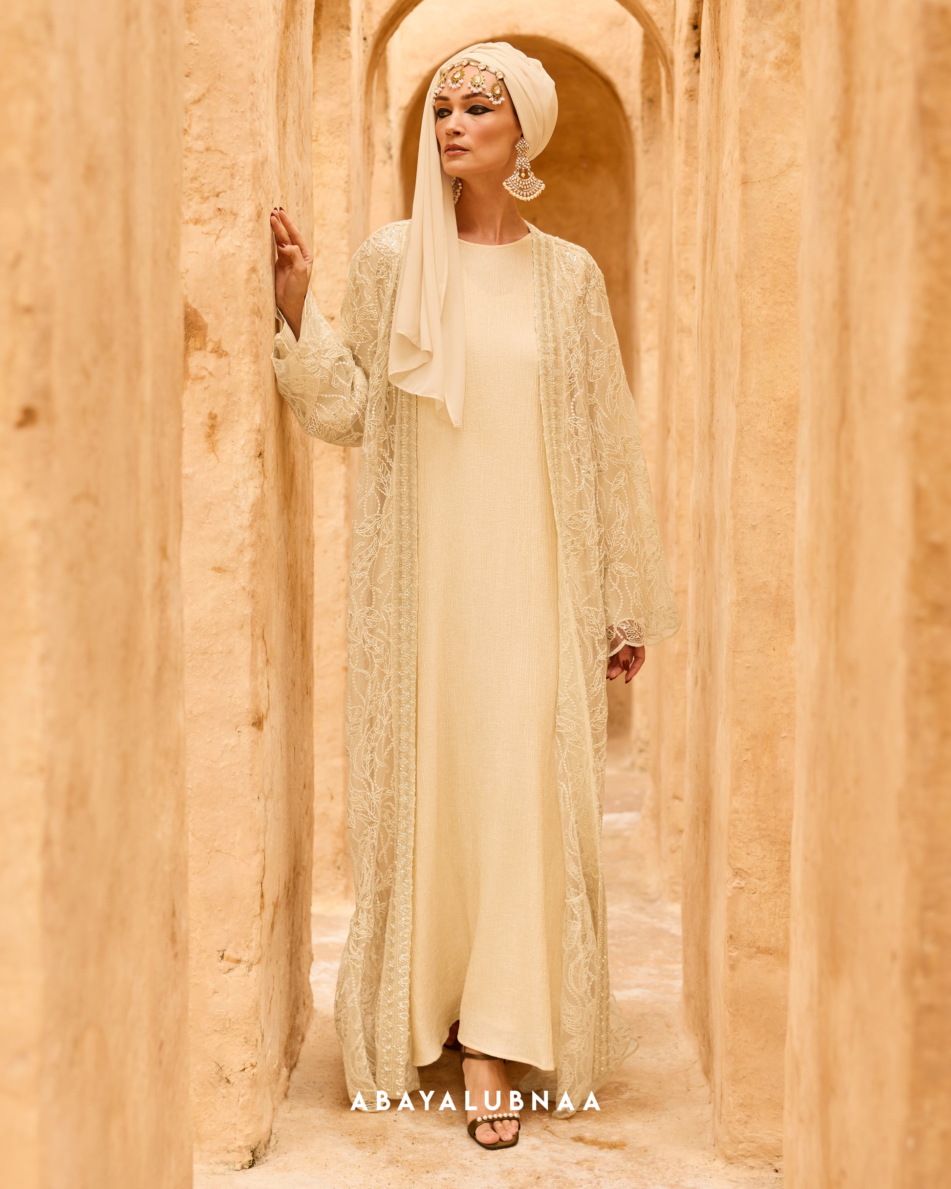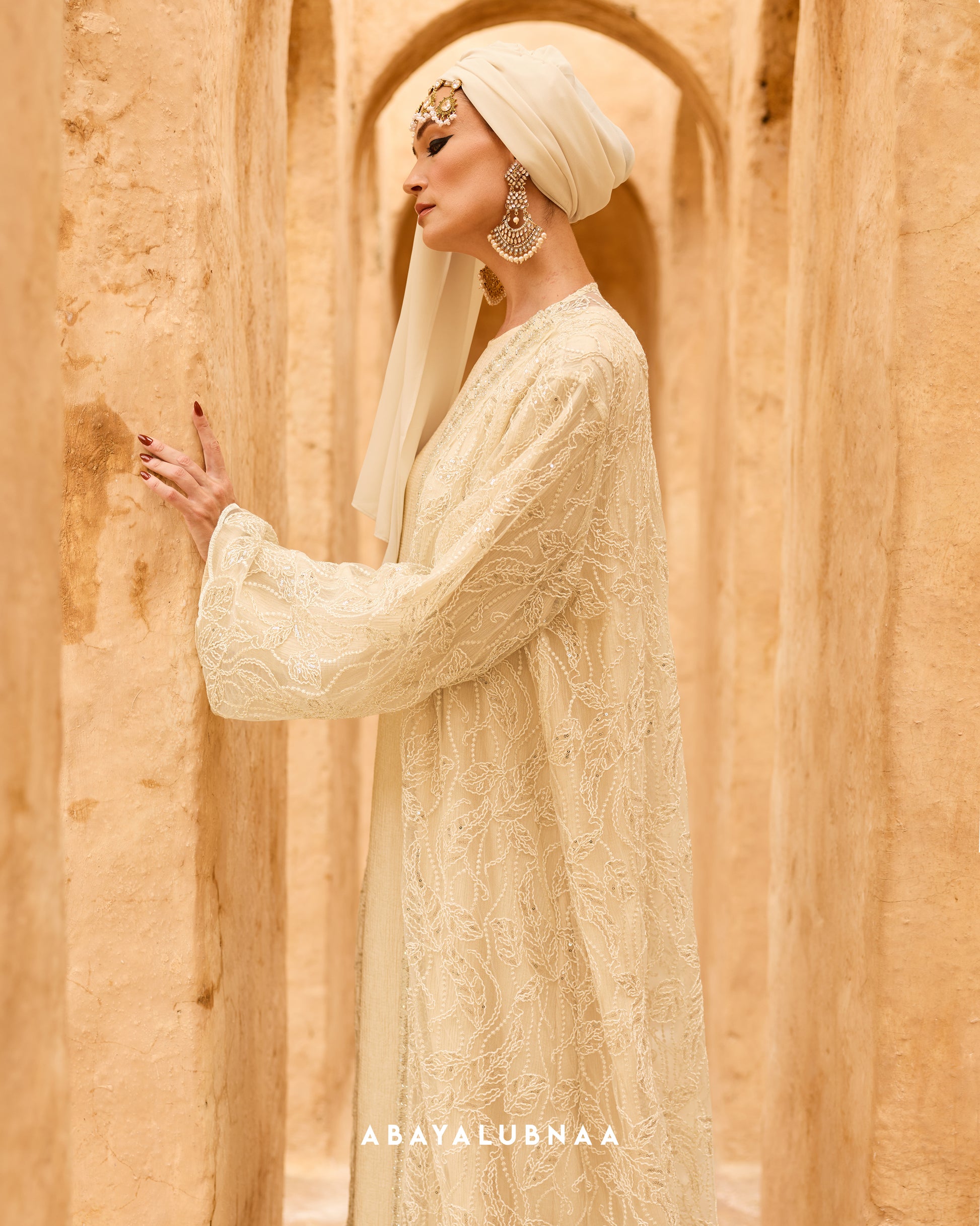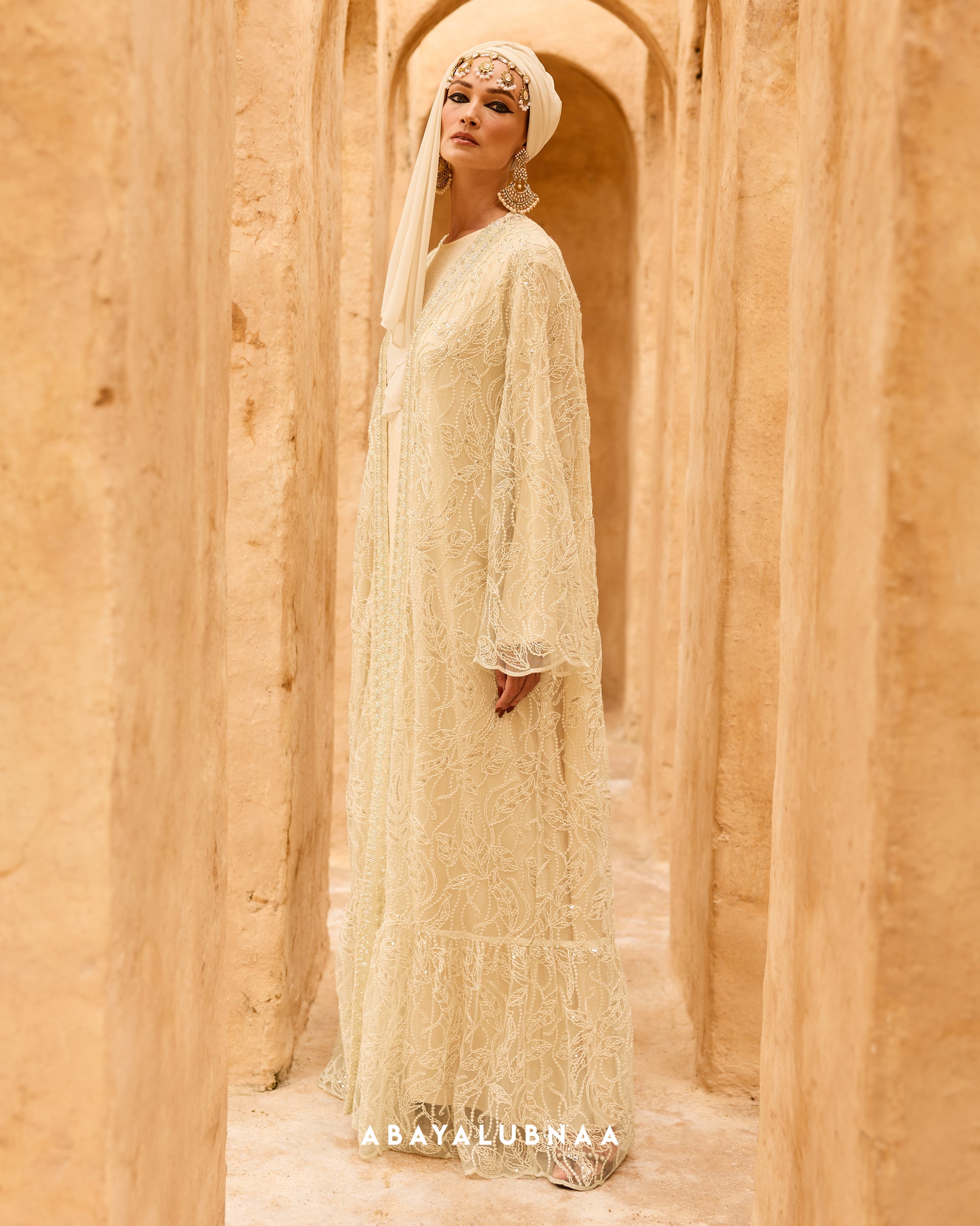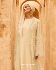 A regal look befitting its name, Sultana is an impeccable design that blends intricate craftsmanship with timeless luxury. Delicate embroidery inspired by Moroccan artistry are seen on the front trim of the abaya, placed over lace lavishly filled with lush botanicals that are a nod to the country’s exotic flora.