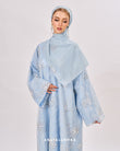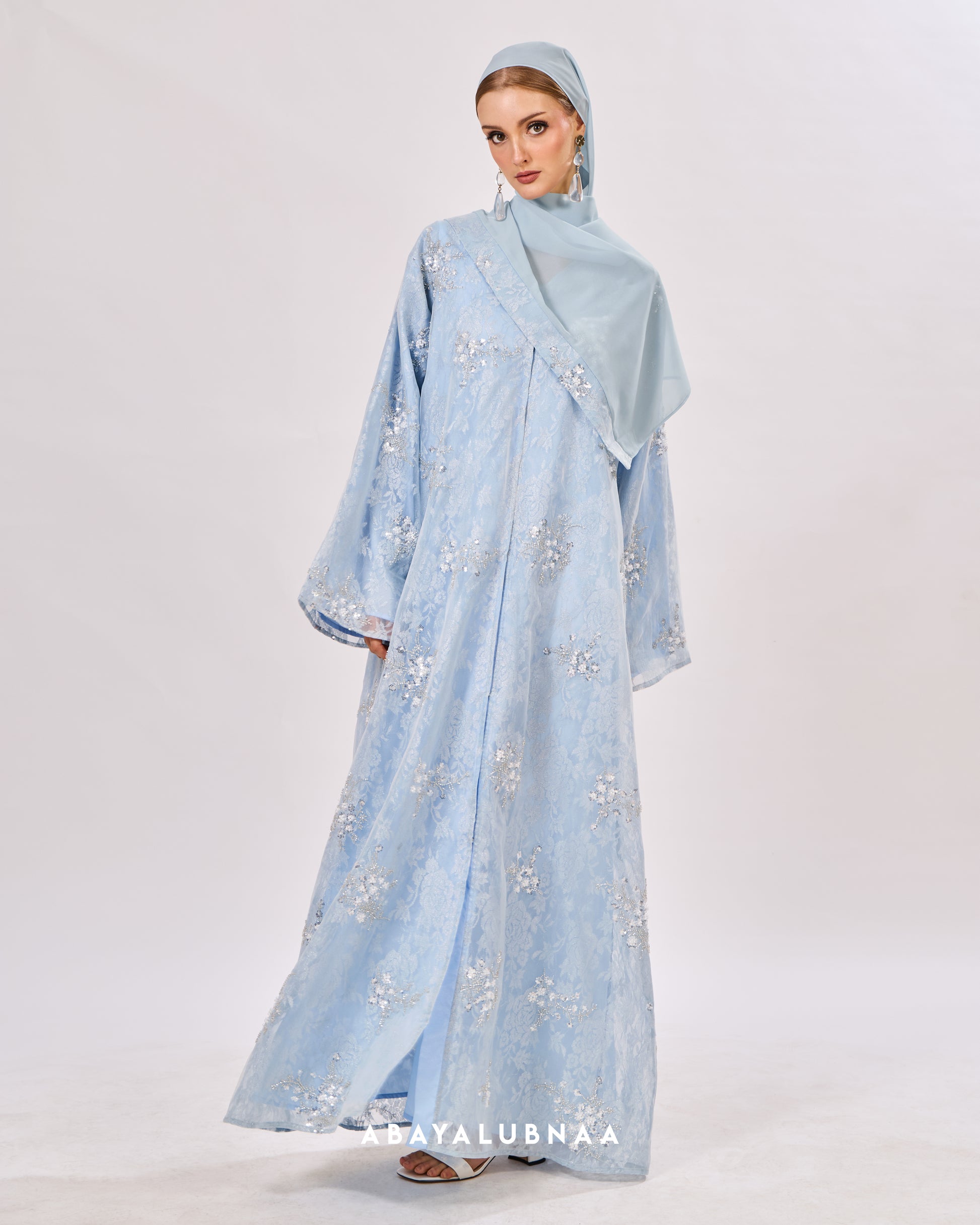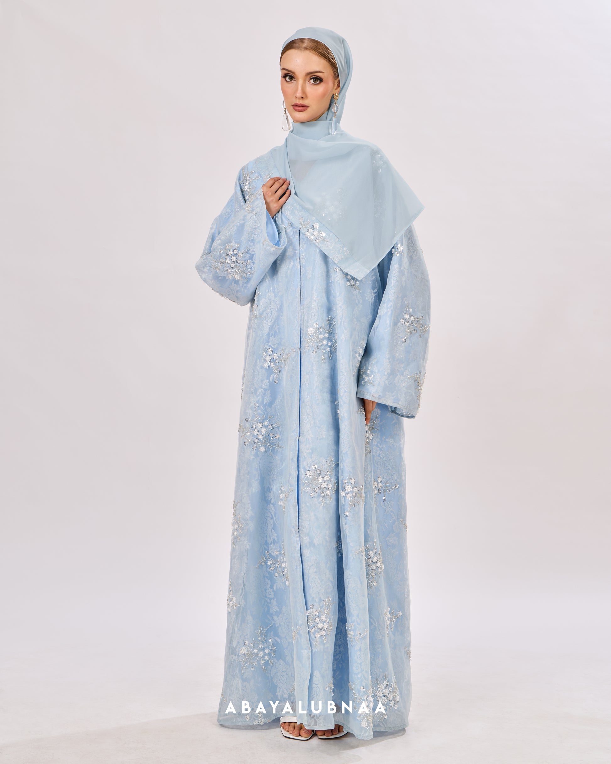 An open-type abaya, Warda features a lace overlay over soft organza, evoking an ethereal and dreamy feel suitable for fans of the coquette aesthetic.