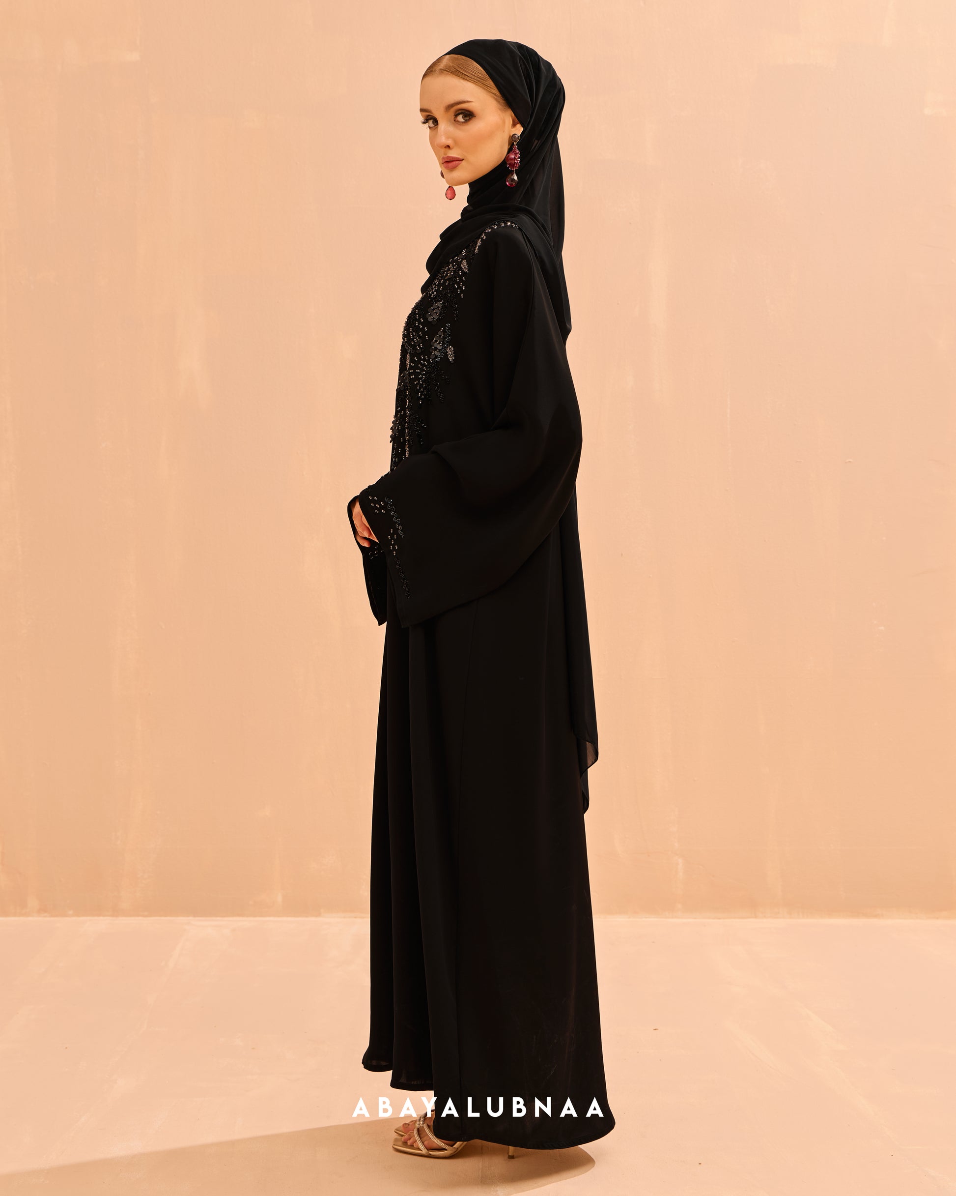 The delicate design on the bodice and sleeves resemble fine vines which mimics Morocco's botanical structures, creating a glamorous and textured look suitable for a celebratory abaya.