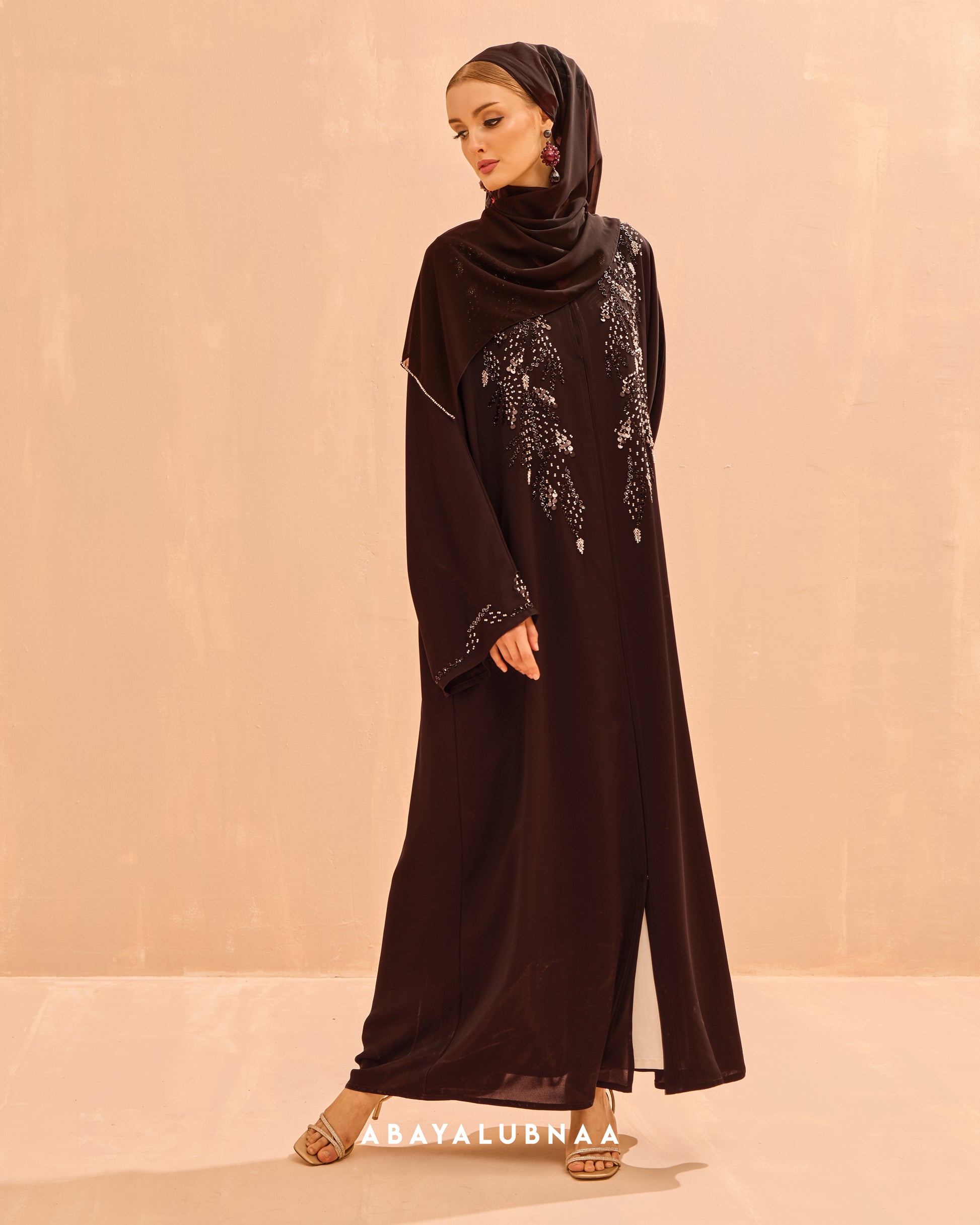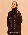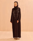 The delicate design on the bodice and sleeves resemble fine vines which mimics Morocco's botanical structures, creating a glamorous and textured look suitable for a celebratory abaya.